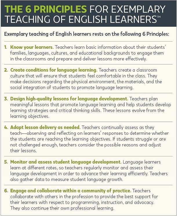 TESOL International Association (TESOL). 2018. The 6 principles for exemplary teaching of English learners: Grades K-12. Alexandria, VA: Author.